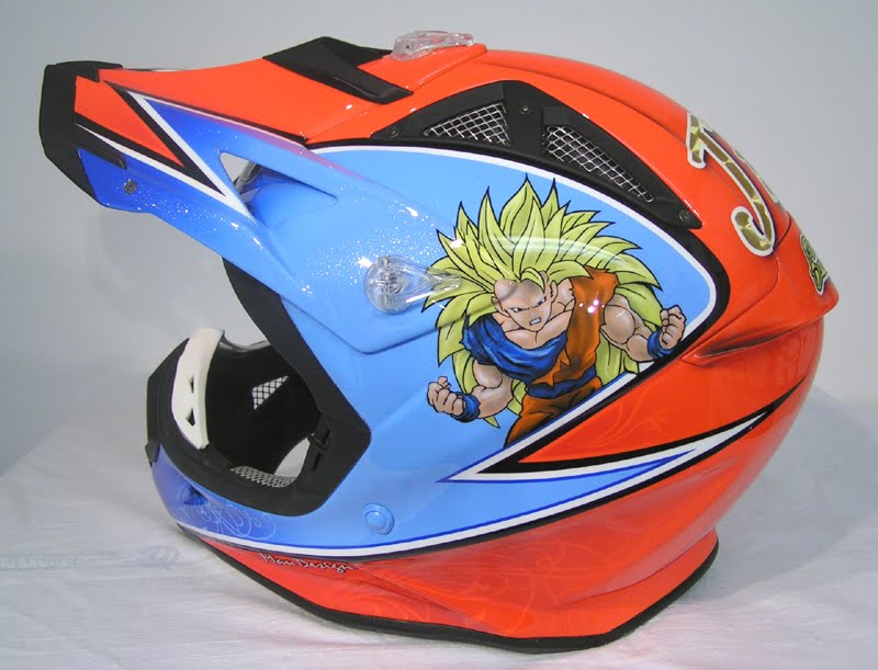 Aerografia su casco Airoh Aviator per il pilota Jonny Falai, che corre nel trofeo HM Honda supermoto. Colori principali rosso fluo e celeste metallizzato, in oltre sono stati realizzate le sue mascotte portafortuna e il suo numero di gara con l'effetto molatura oro (engine turn gold).